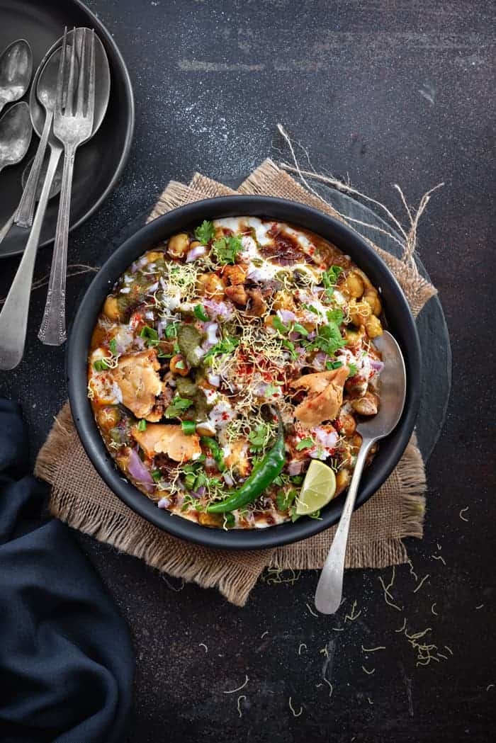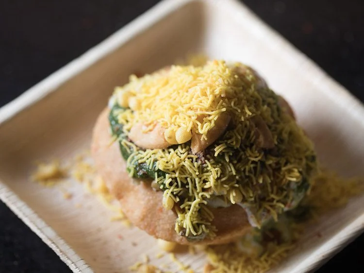 Fried hollow shell. potato. onion. pomegranate. yogurt. spices. chutney.