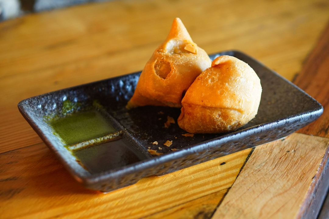 Veg samosa. chickpeas, green chili, onion, cilantro, spice mix.