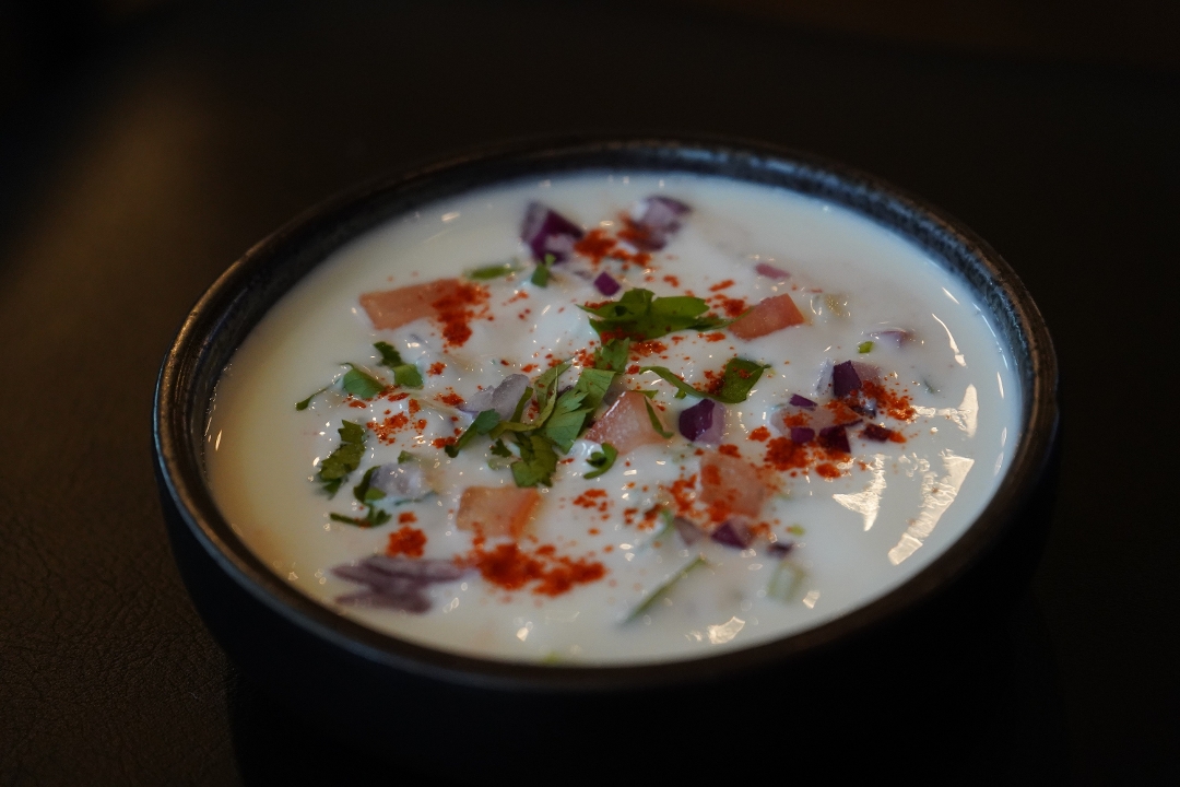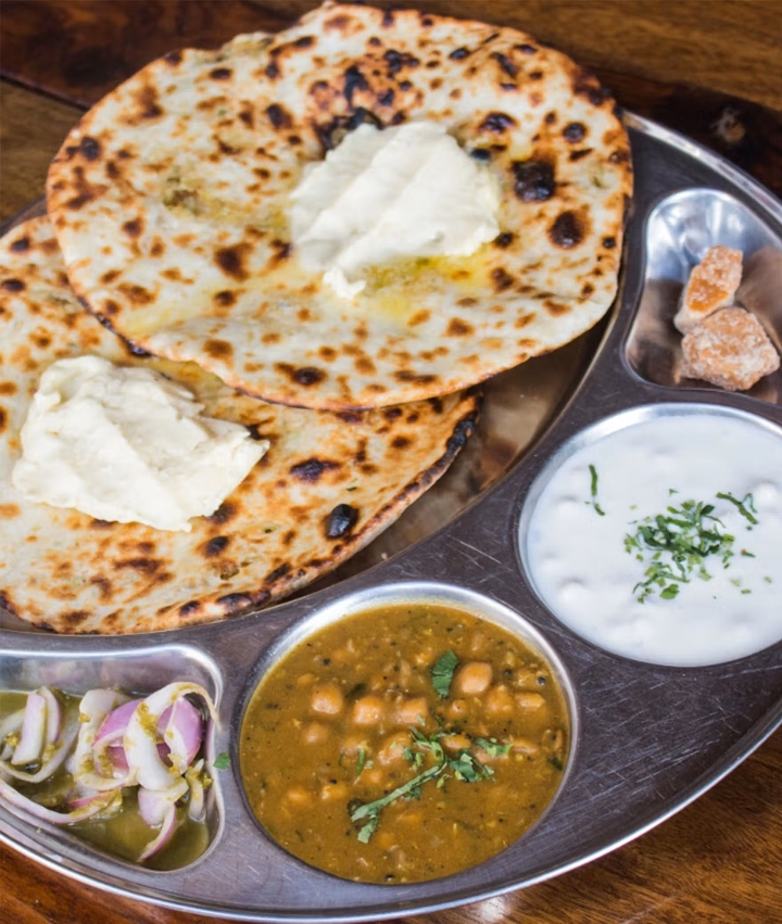 Stuffed kulcha served with mixed veg raita. Choice of Potato, Onion, Cheese, Paneer, or Chicken, priced separately.
