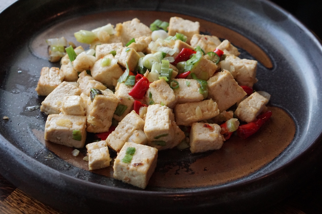Gluten free. Vegan. Spicy. Fried tofu cubes. green & red chili. ginger. sesame oil