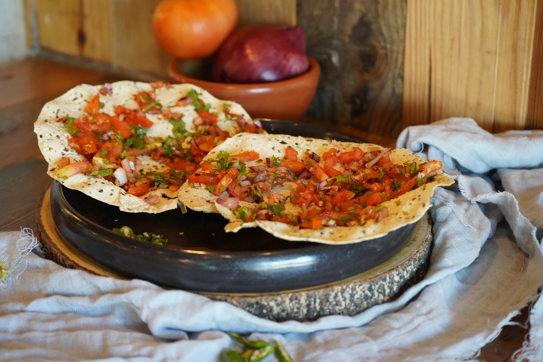 Gluten free. Vegan. Fried papad, onion, cilantro, tomato, lemon juice, spices.