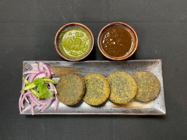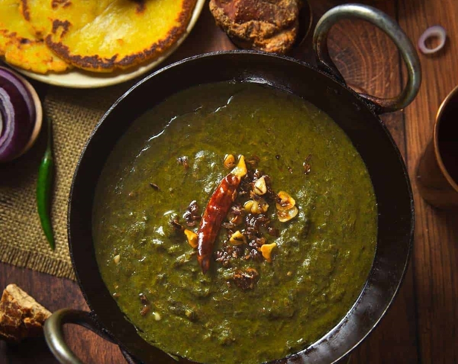 Fried spinach. onion. tomato. yogurt. spices. chutney.
