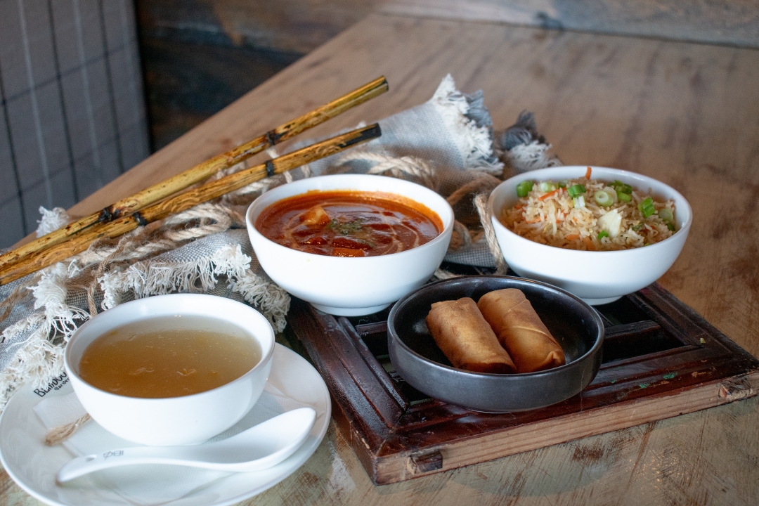 Vegan. Spicy. Battered cauliflower, cilantro, onion, green chili, celery. Dry available. Chinese Lunch Specials served with Veg Spring Roll & Soup of the Day. Choice of Rice: Steamed White/Veg/Chicken Fried Rice. Add Veg/Chicken Hakka Noodles $4.