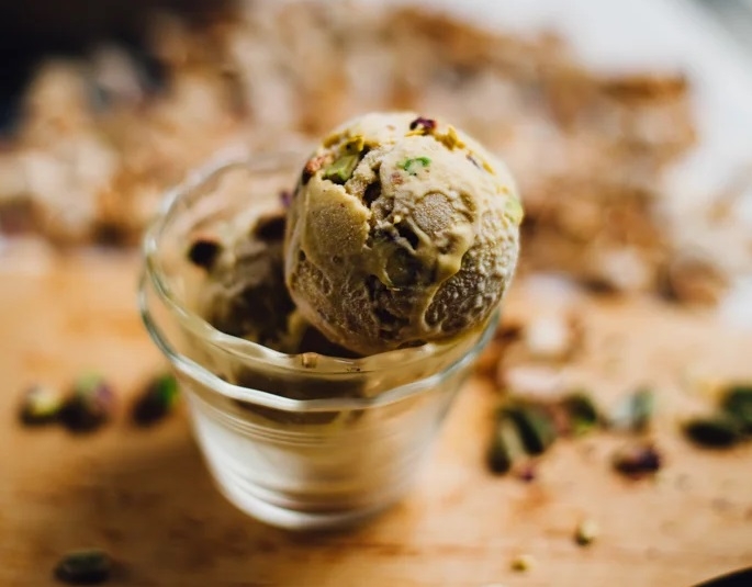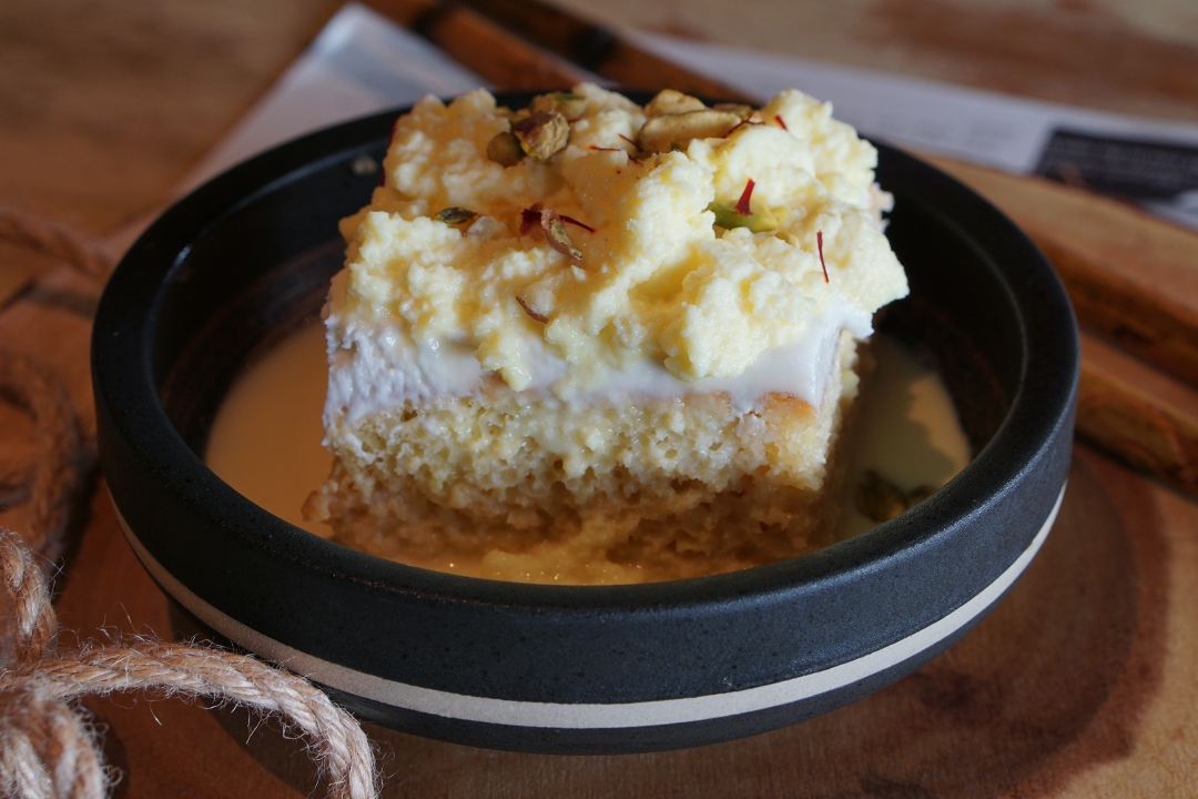 Gluten free. Saffron milk, flattened cottage cheese, pistachio, almond.