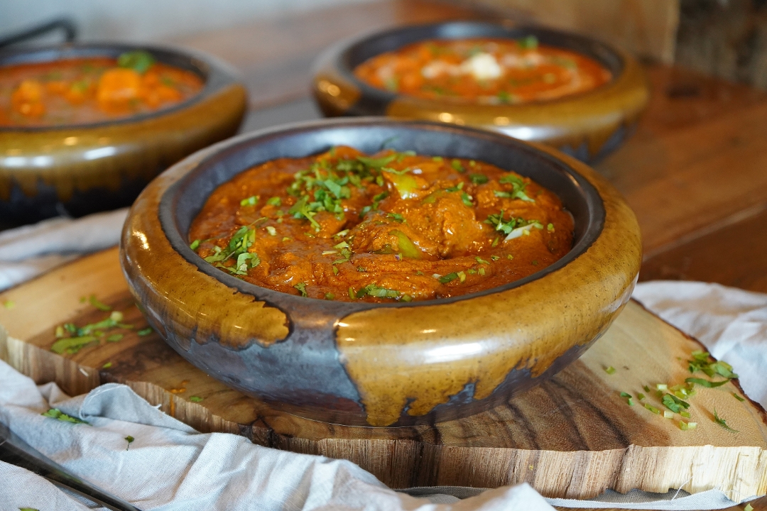 Gluten free. Spicy. Chicken, tomato puree, onion, garlic, ginger, butter, cilantro, cream, spice mix, honey, cashew.