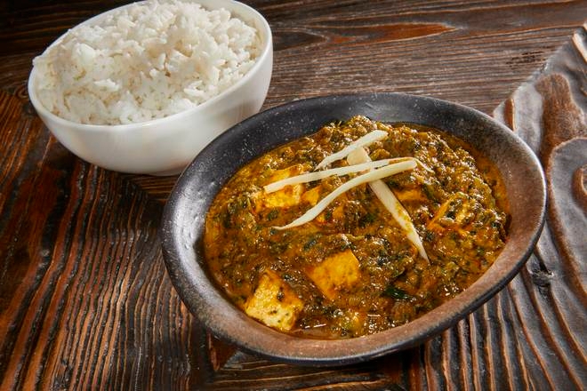 Gluten free. Spicy. Spinach. garlic. ginger. onion. green chili. tomato. yogurt. cashew. Choice of Paneer/Chicken/Lamb/Goat.