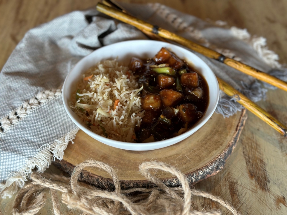 Gluten free. Vegan. Fried tofu cubes. green & red chili. ginger. sesame oil. Chinese lunch specials served with Veg Spring Roll and Soup of the Day. Choice of Rice: Steamed White/Veg/Chicken Fried Rice. Add Veg/Chicken Hakka Noodles $4 extra.