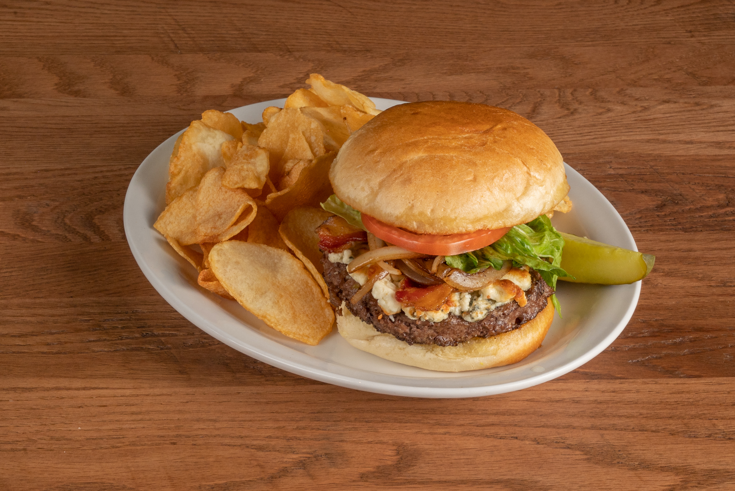 Our fresh Angus beef patty char grilled and topped with crispy bacon, crumbled bleu cheese, lettuce, tomato and red onion on a fresh brioche roll.