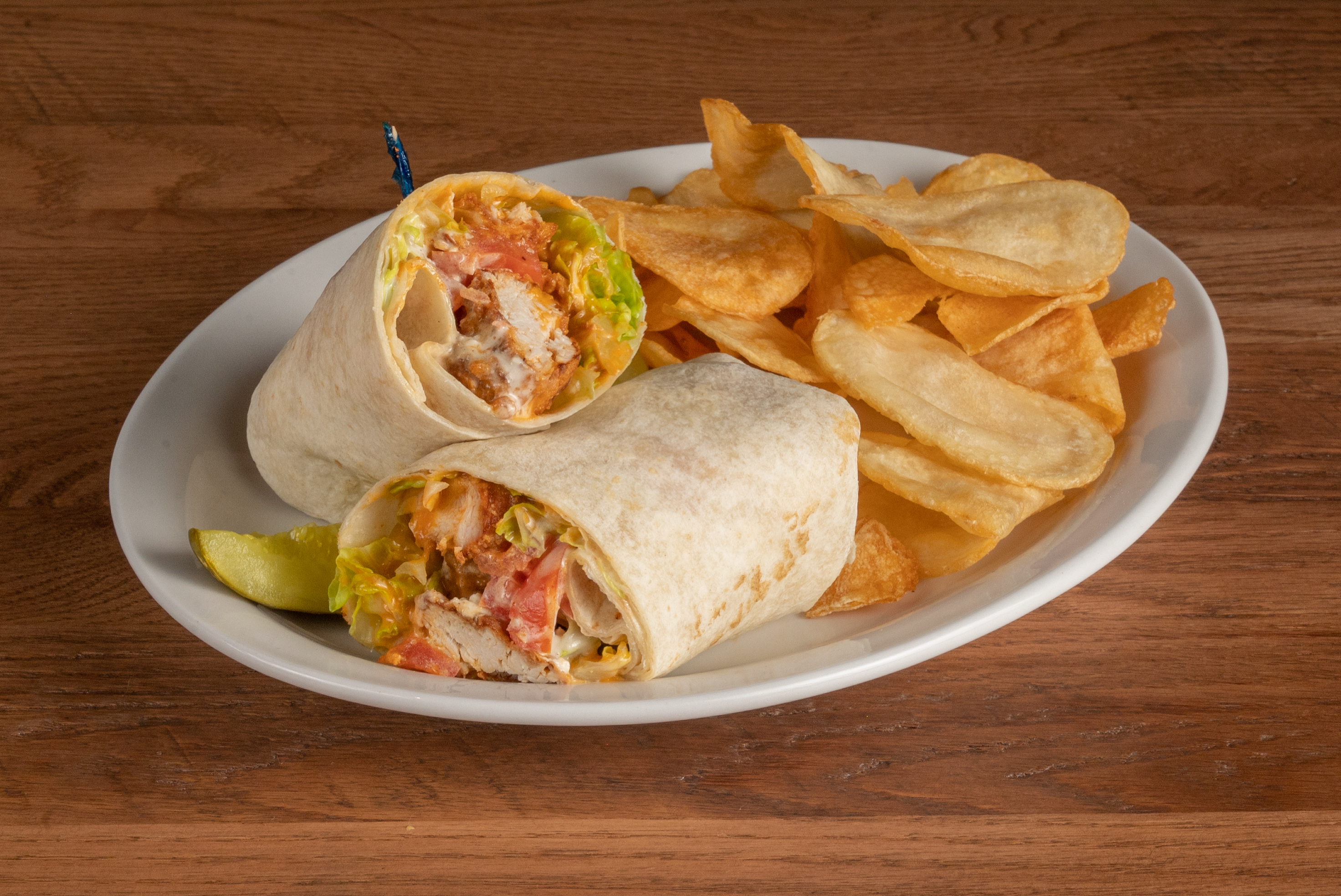 Breaded chicken strips tossed with our Original (Medium) Anchor Bar Wing Sauce, tomato, cheddar, bleu cheese dressing and lettuce wrapped in a our tortilla.