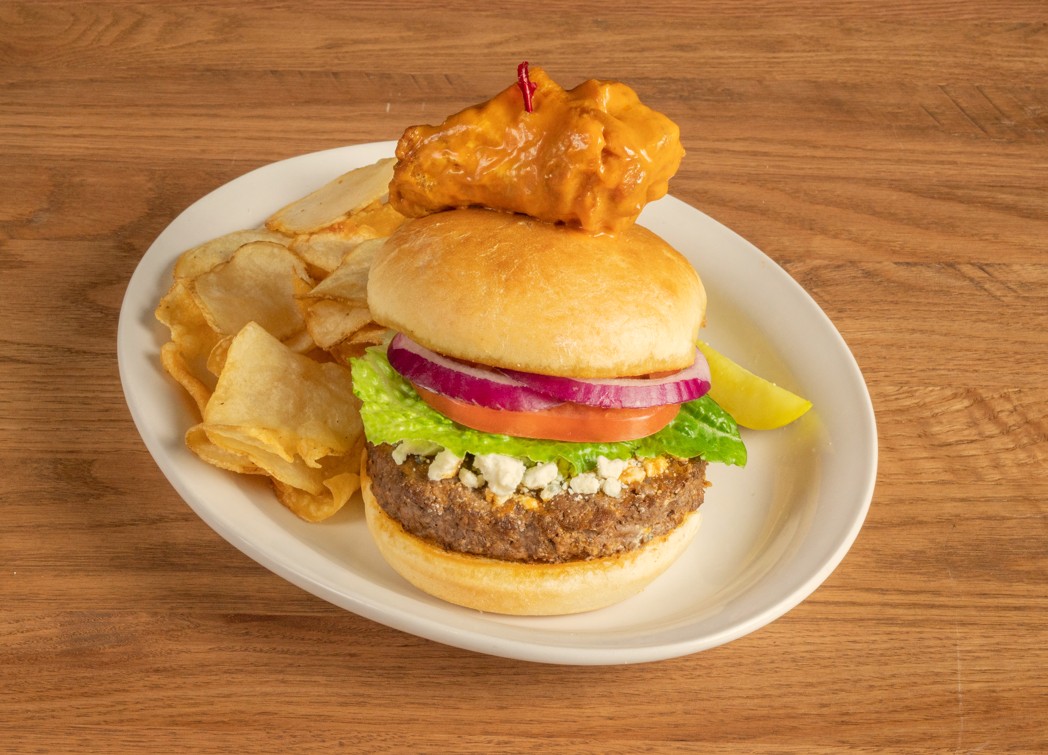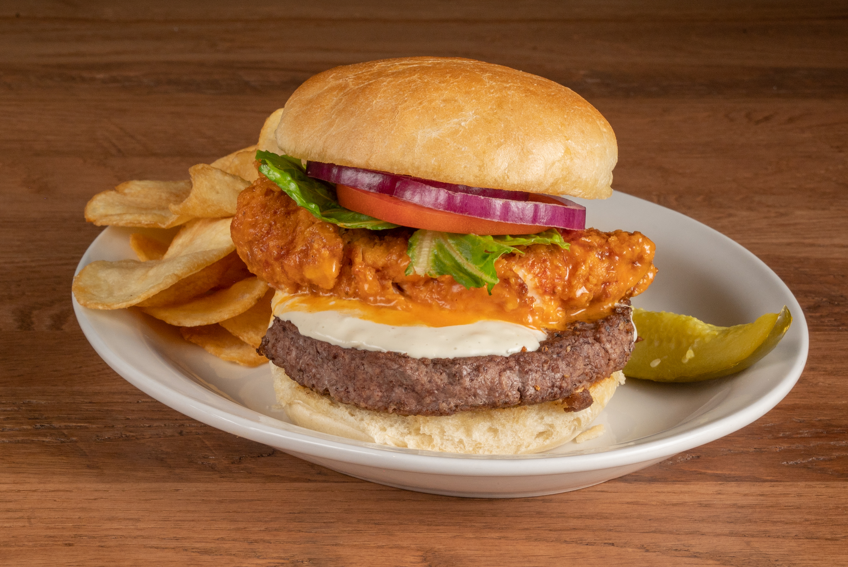 Our fresh Angus beef patty char grilled and topped with a chicken tender tossed in Anchor Bar Original (Medium) Wing Sauce, topped with Provolone cheese, lettuce, tomato, and red onion served on a fresh brioche roll. Served with a side of bleu cheese.