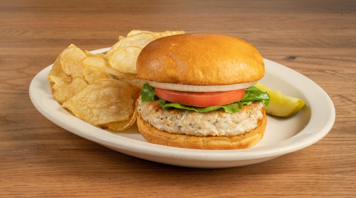 A lean 8 oz seasoned turkey burger char broiled to perfection, topped with lettuce, tomato and red onion.