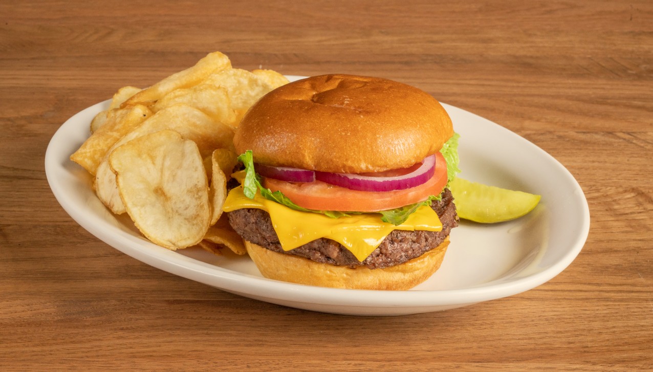 Our fresh Angus beef patty char grilled topped with American cheese, lettuce, tomato and red onion on a brioche roll.