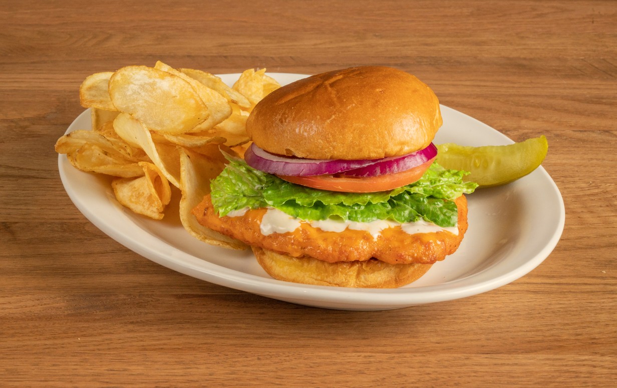 Breaded chicken breast tossed in Original (Medium) Anchor Bar Wing Sauce topped with lettuce, tomato and red onion. Served with bleu cheese dressing on fresh roll.