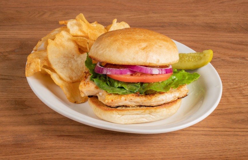 Juicy chicken breast grilled and topped with lettuce, tomato and red onion on a fresh roll.