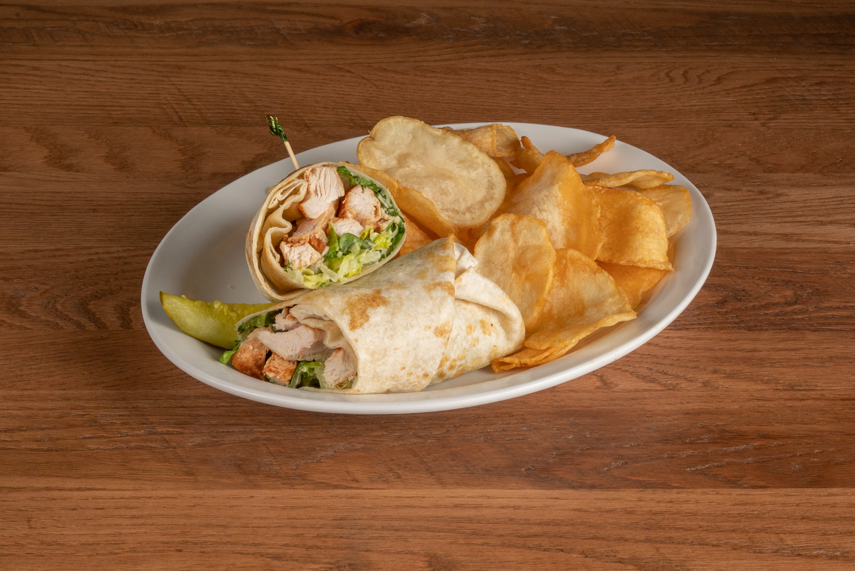 Tender grilled chicken strips with crisp romaine lettuce, parmesan cheese and cream caesar dressing wrapped in a our tortilla.